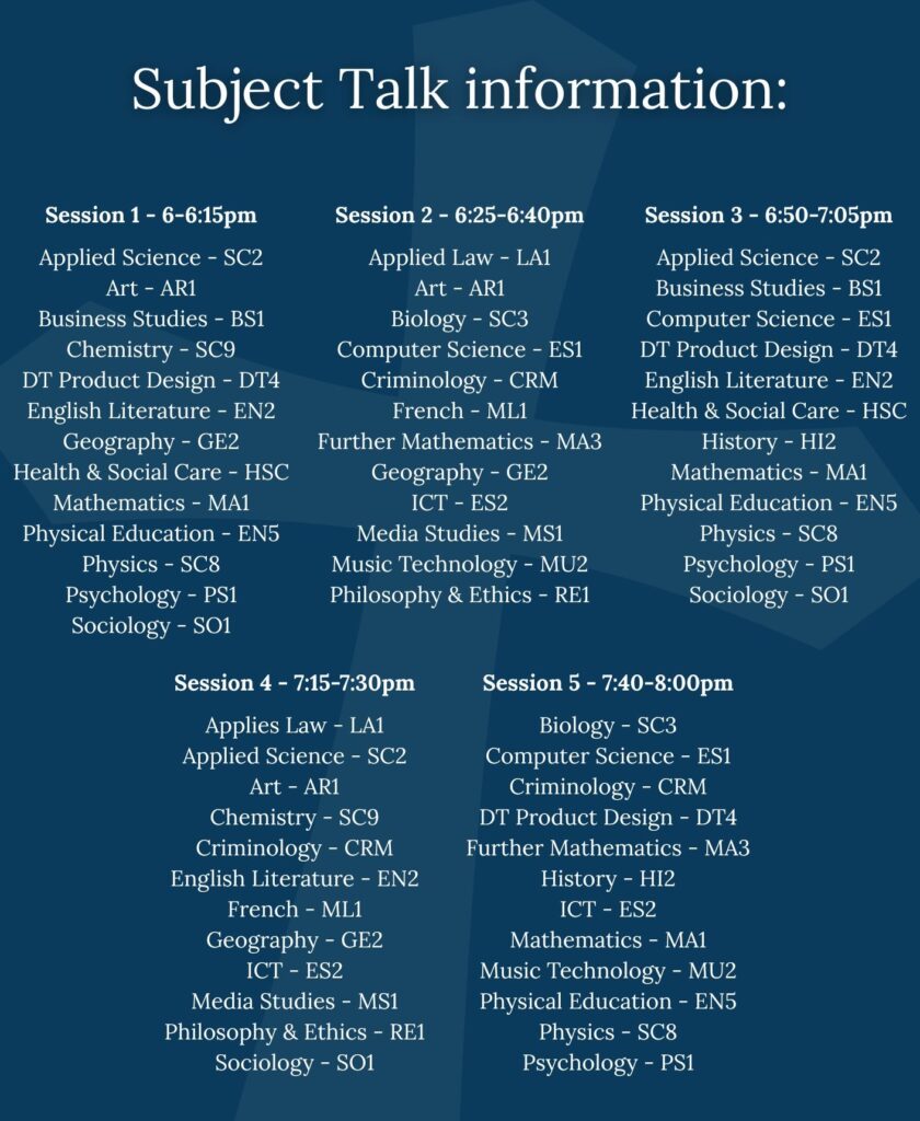 The locations and times for subject talks are listed below and will also be available upon arrival at the open evening